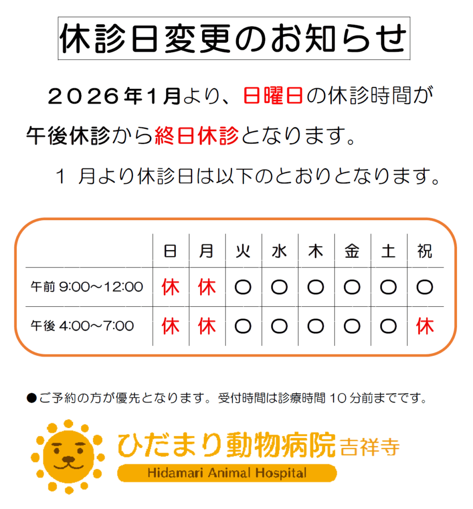 突然の変更で申し訳ありませんが、3月18日より毎週月曜日を休診日とさせていただきます。 ホテルのお預かりやお迎えは事前にご予約をいただけましたら、対応させていただきます。 突然の休診、お知らせとなり誠に申し訳ございません。